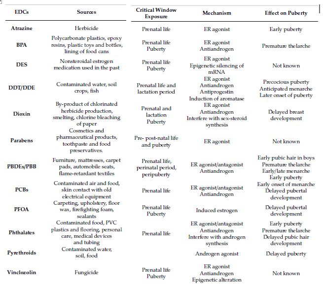 I dati mostrano una associazione tra l’esposizione ai PBDEs (polybrominated diphenyl ethers), telarca e menarca precoce; se l’esposizione avviene nel periodo prenatale il menarca sarà ritardato, mentre nei maschi si osserverà la comparsa precoce dei peli pubici. Invece, l’esposizione durante il periodo peri-puberale sembra interferisca con il normale sviluppo dell’apparato riproduttivo.